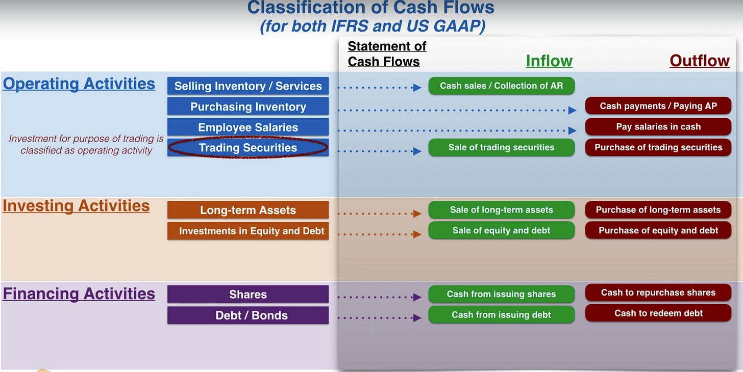 nếu công ty kinh doanh mua bán chứng khoán thì dòng tiền sẽ nằm trong Operating. Chỉ khi công ty phát hành trái phiếu/ cổ phiếu thì mới vào Financing.